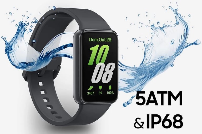 Resistência à água com classificação IP68, projetada para o uso diário, suportando contato com água, suor e respingos durante atividades comuns da rotina.